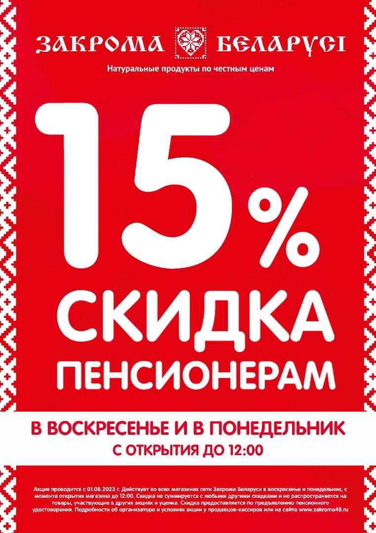 Скидка 15% для пенсионеров по воскресеньям и понедельникам с 9:00 до 12:00 (при предъявлении пенсионного удостоверения).