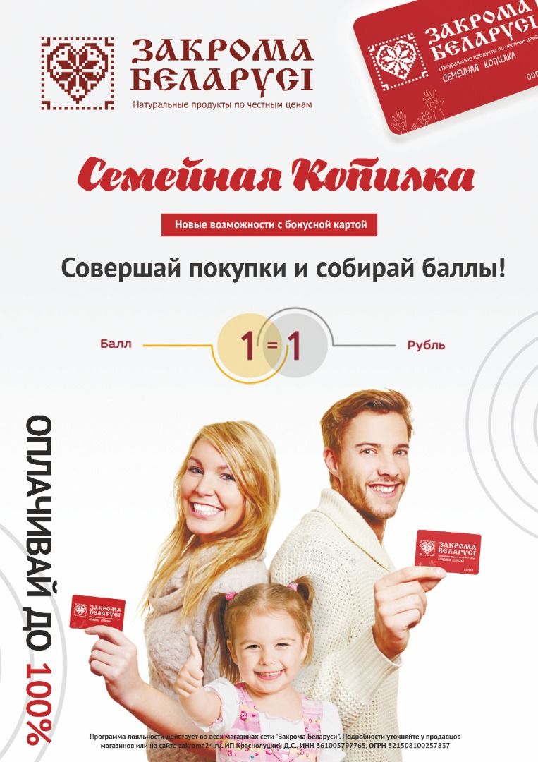 Программа лояльности «Семейная копилка» – накапливайте баллы и оплачивайте ими до 100% покупки. 1 балл = 1 рубль.